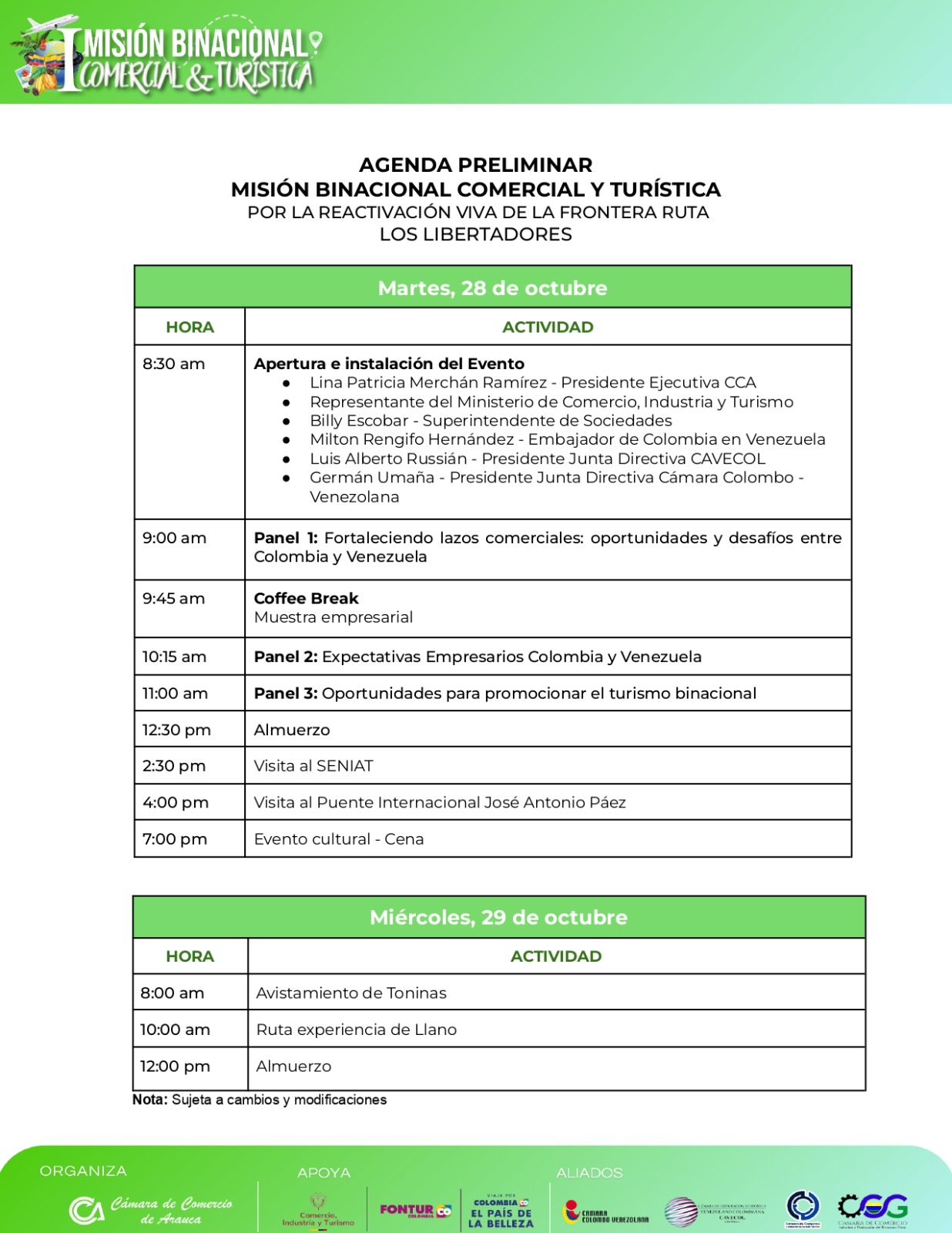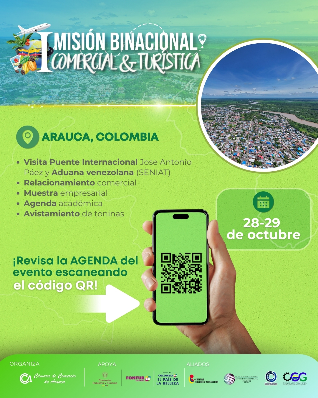 La Cámara de Comercio de Arauca, se complace en invitarlos a participar en la I Misión Binacional Comercial y Turística, que se llevará a cabo los días 28 y 29 de octubre de 2025 en la ciudad de Arauca.